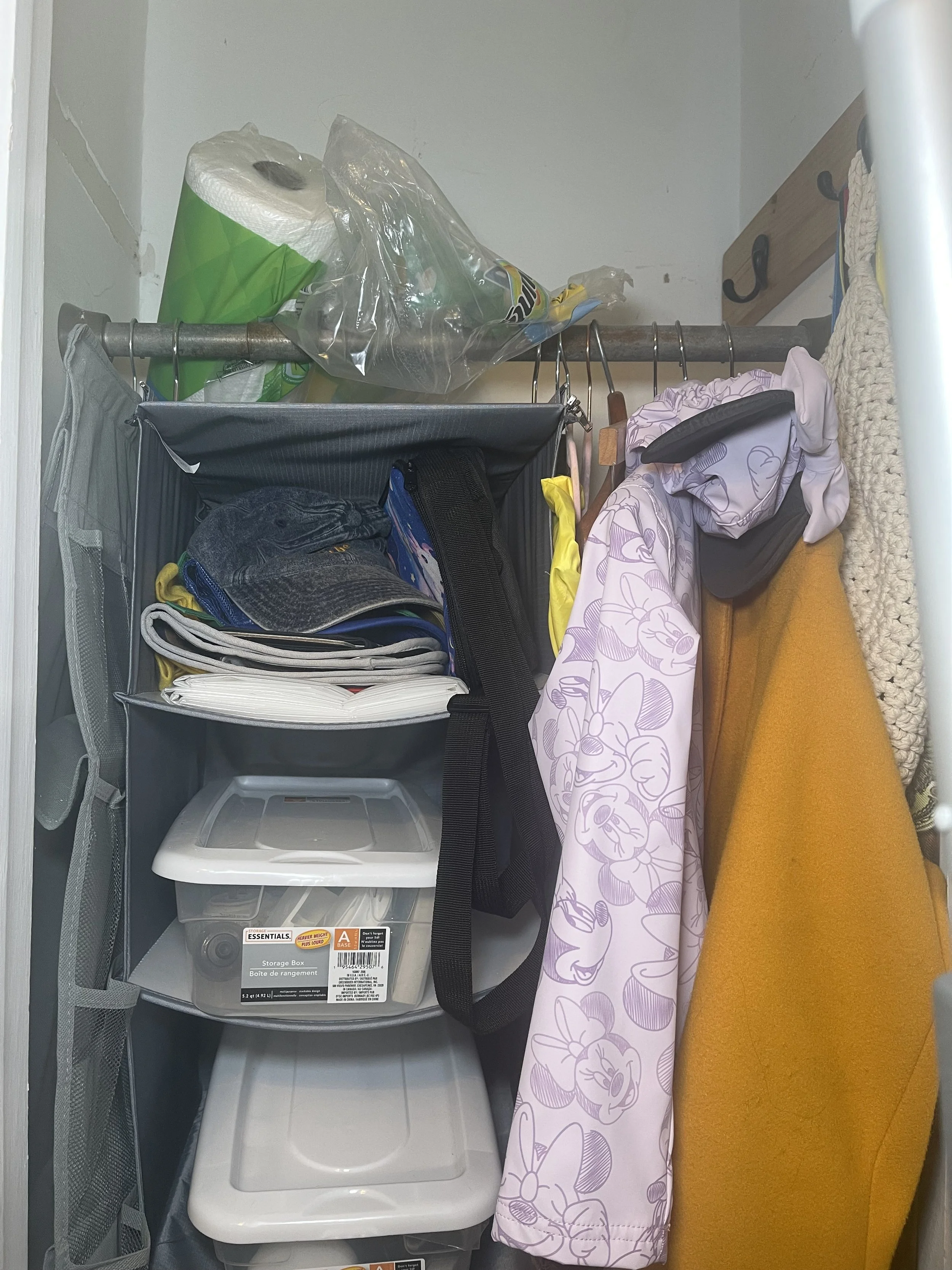 It has exactly one shelf and one hanging rod. That’s it. Which means it’s wildly unhelpful for small items and deeply confusing for everything else. Nothing in there ever felt intentional, just shoved, stacked, leaned, or forgotten. Every time I opened it, something either fell out as a literal attack against my person, or silently judged me. I preferred the judging.