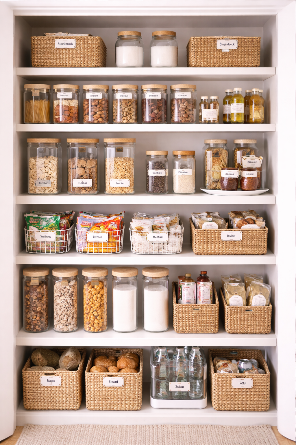 Matching containers reduce visual noise, even in spaces you don’t see every day, like pantries, laundry rooms, and linen closets. When everything speaks the same design language, a space feels calmer and more intentional.