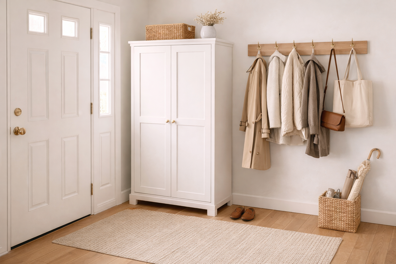 The most functional entryways prioritize closed storage over open hooks and baskets. The goal isn’t to eliminate everyday clutter, it’s to contain it.