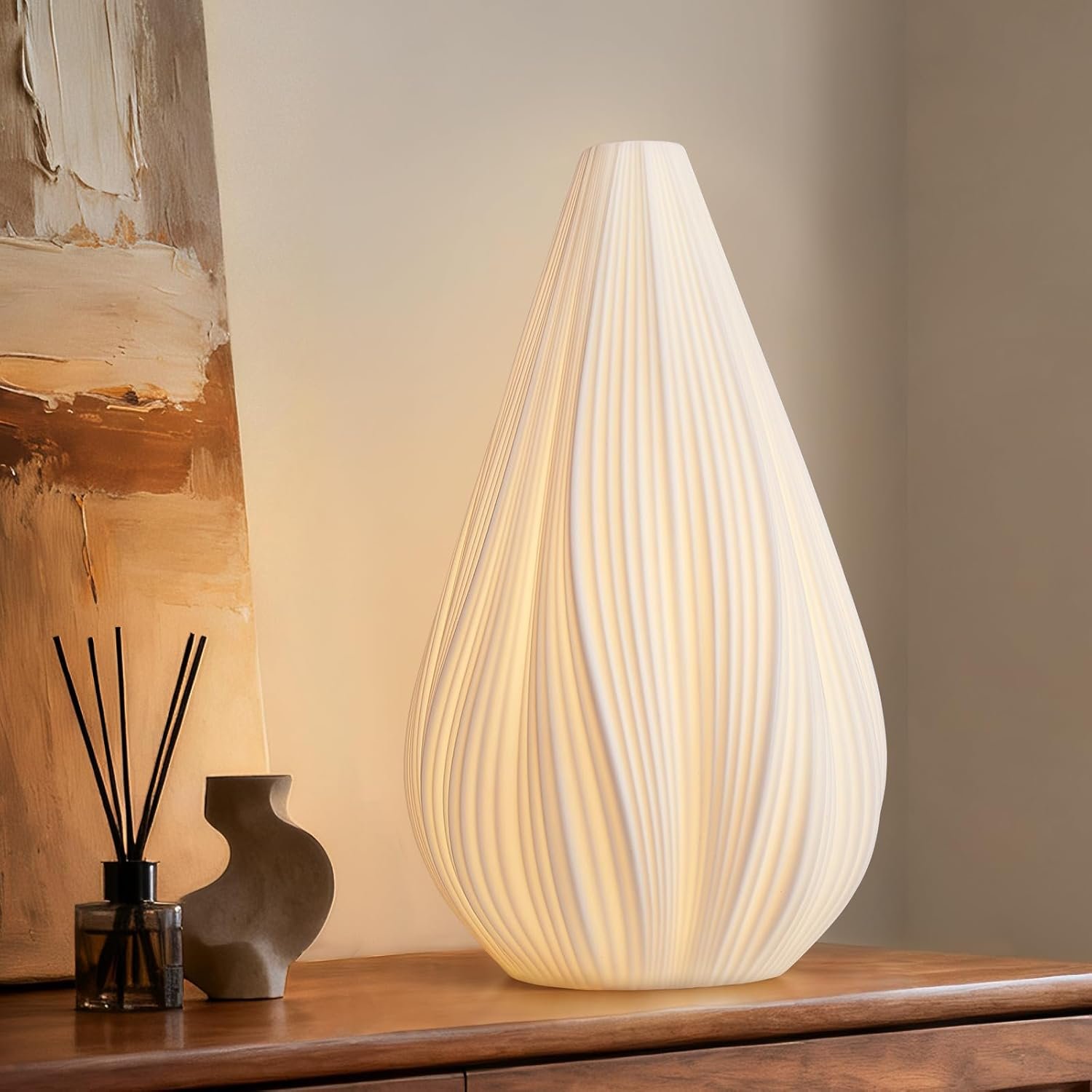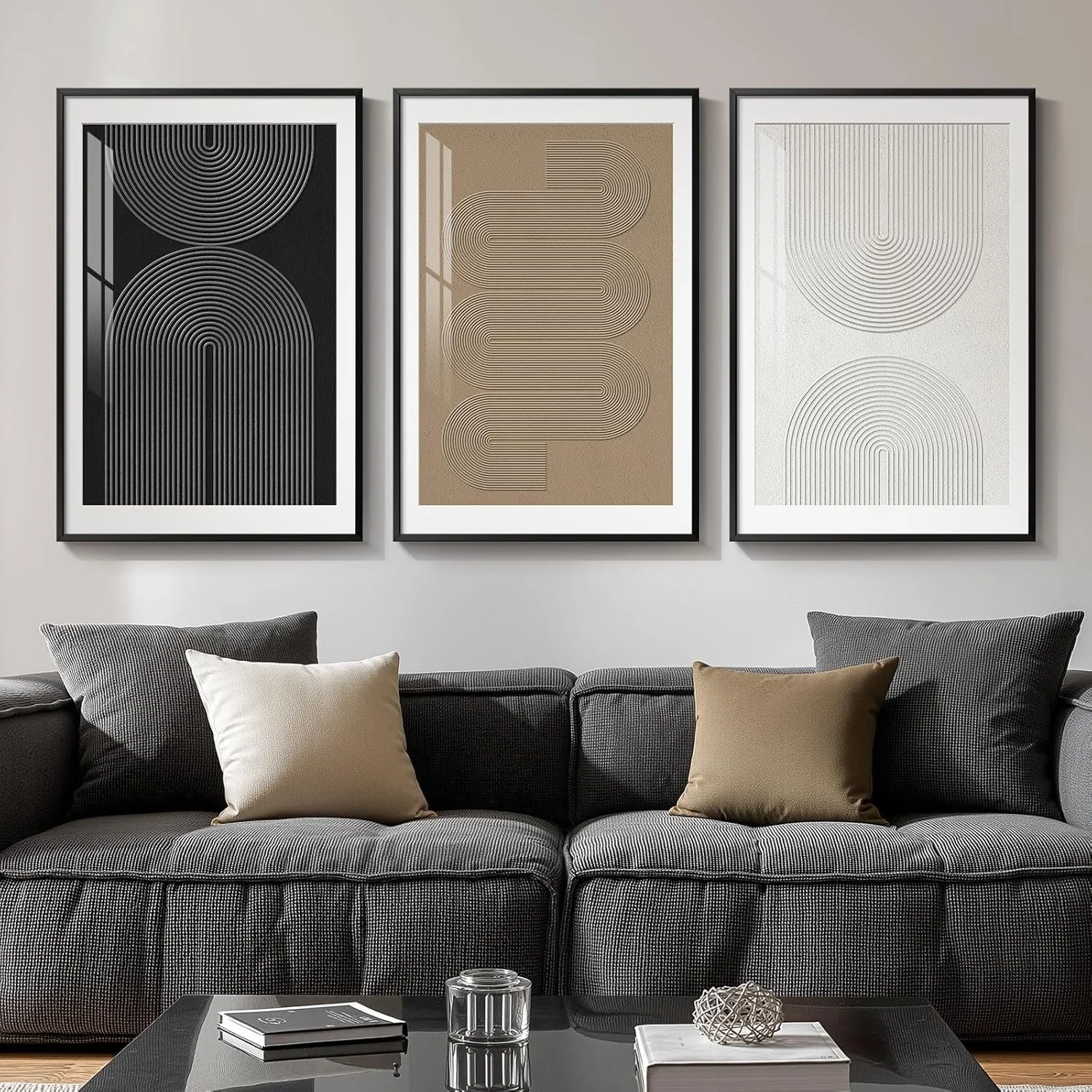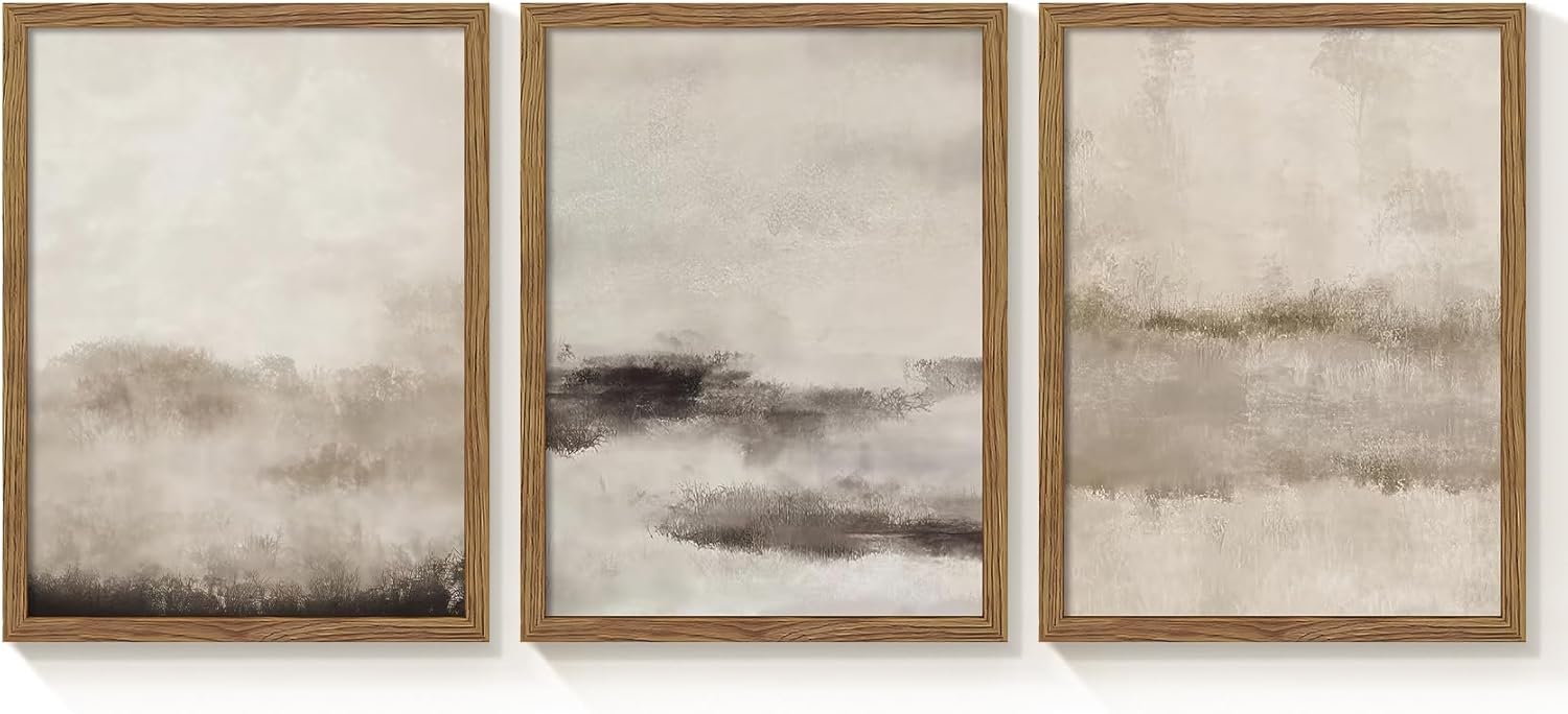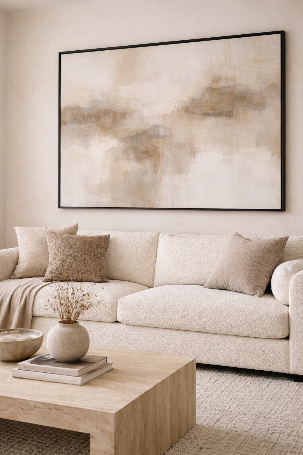 One good piece of art will always beat five random ones, especially in a neutral room. A larger print with movement, texture, or an interesting shape gives your eye somewhere to land. It creates tension in a good way, the kind that makes a room feel finished instead of decorated out of obligation.