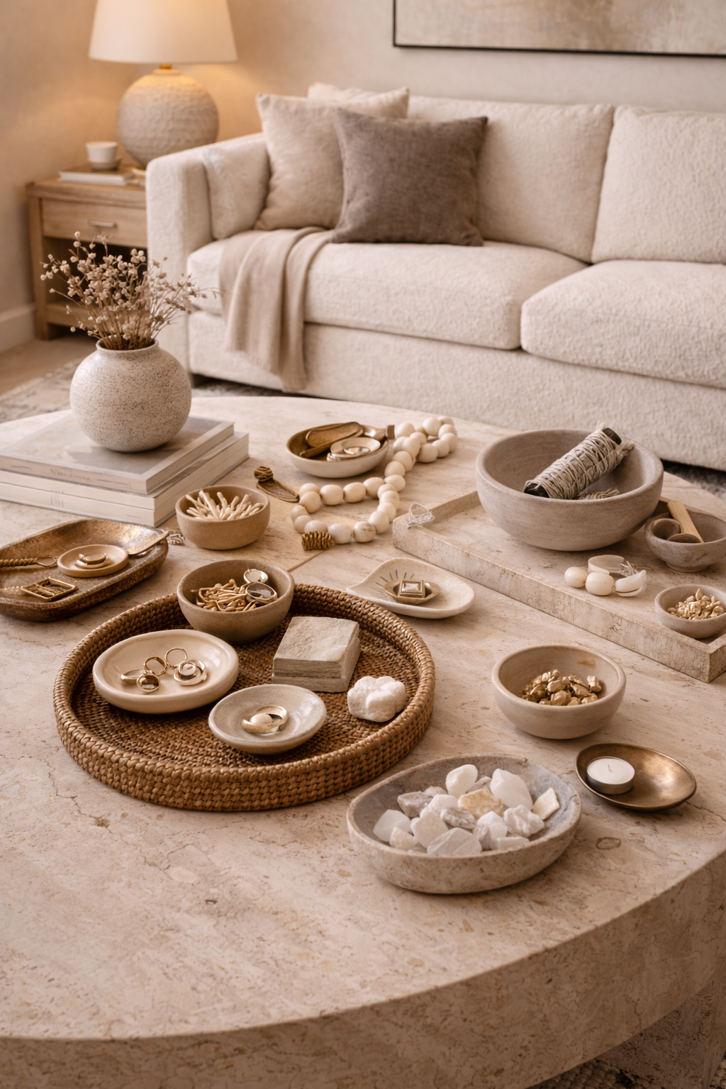 Textured rugs, ceramic or plaster lamps, linen curtains, stone or matte objects, nothing loud, nothing fussy. Just materials that feel good and make the space more interesting without adding visual noise.