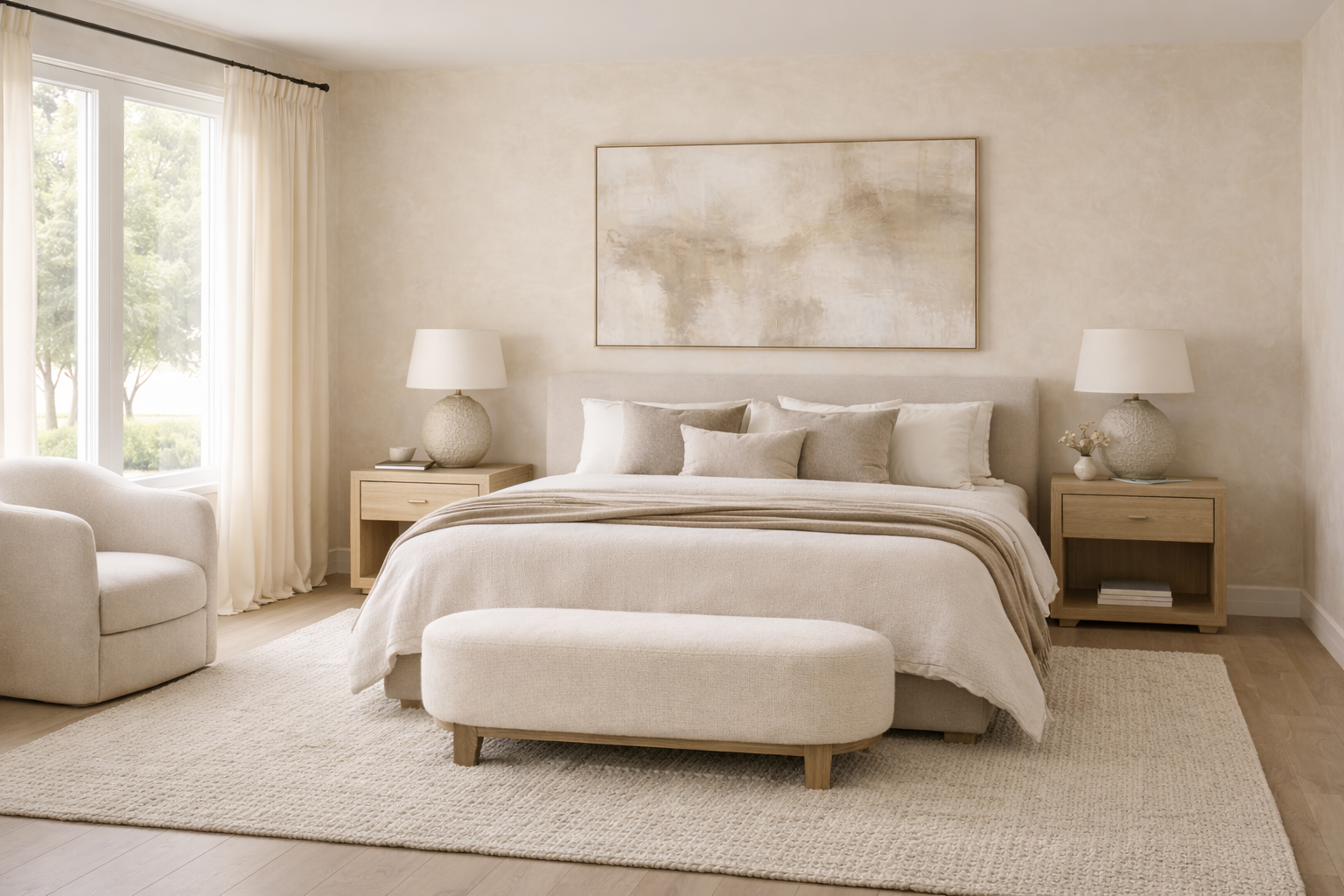 This is where neutral decor quietly gets interesting. A chunky rug under a clean lined sofa. A ceramic lamp that isn’t perfectly smooth. Linen curtains that hang a little casually instead of stiff and starched. None of these pieces are loud on their own, but together they create depth. They make the room feel layered and intentional without adding color or clutter.