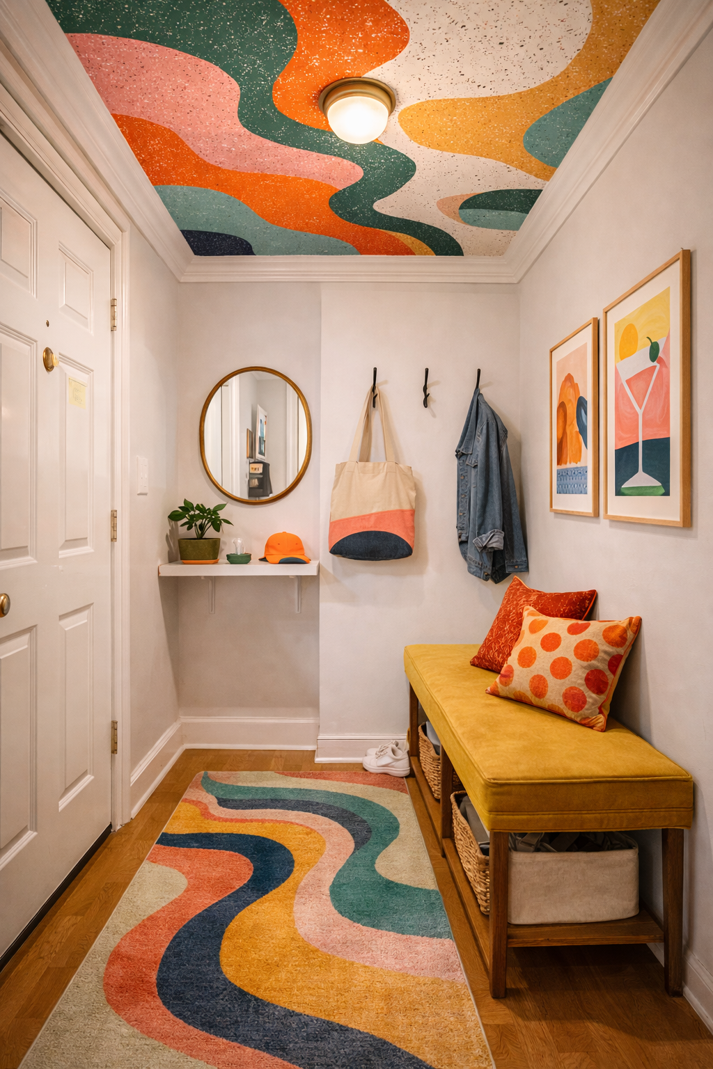 This is where wallpaper really earns its keep. In small spaces, like an apartment entry right off the front door, square footage is limited, so the design has to think vertically. A bold, peel and stick ceiling turns what could be a forgettable pass through into a moment, while the rest of the space stays practical: a drop zone, a mirror, and seating that actually works.